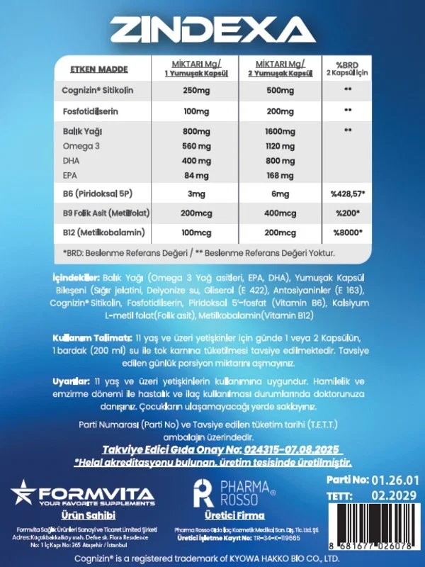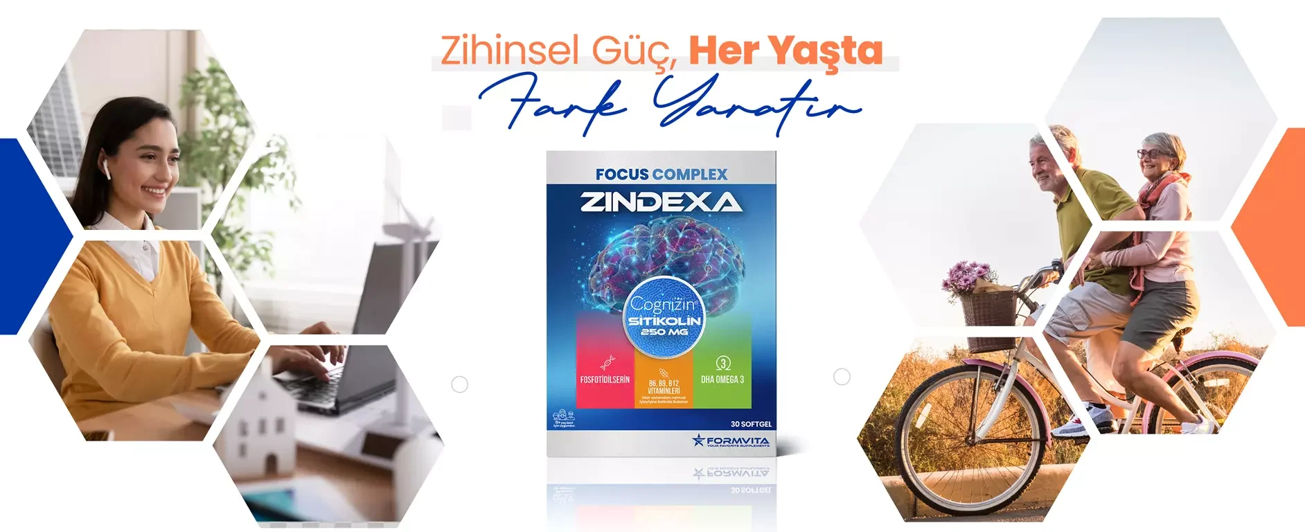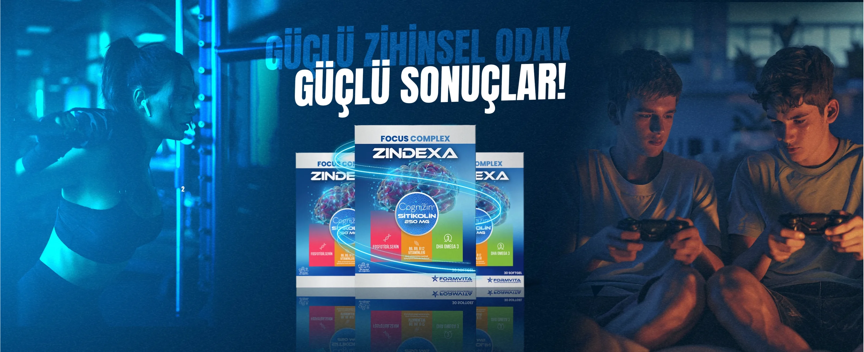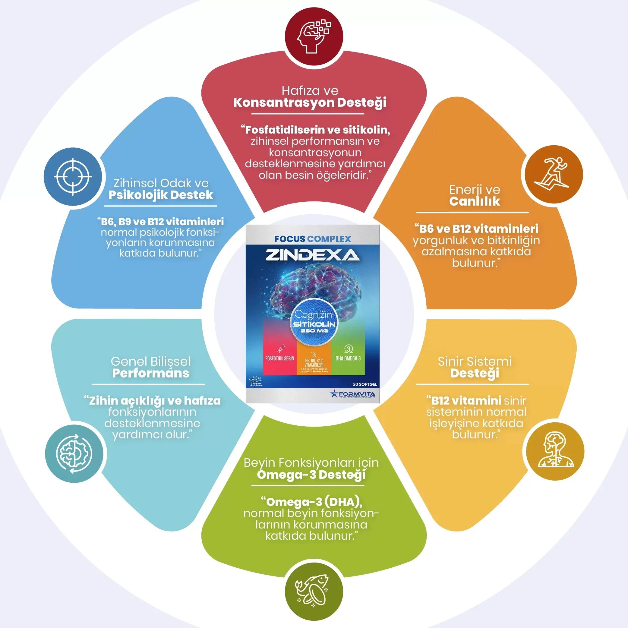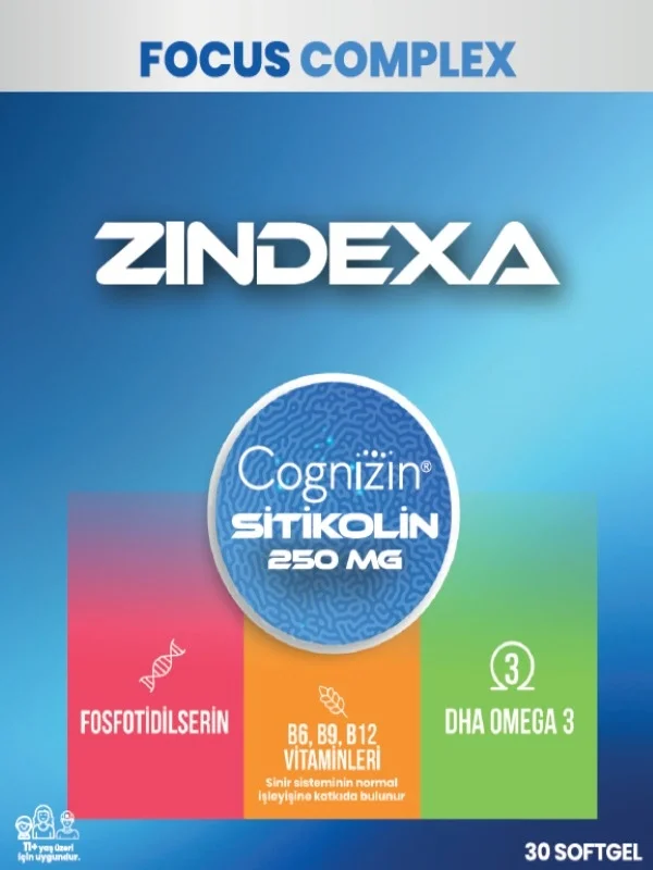 Focus Complex Zindexa, içeriğinde yer alan özel olarak seçilmiş Sitikolin(Cognizin), Fosfotidilserin, Omega 3, B12, B9 ve B6 bileşenleriyle 11 yaş üstü yetişkinlerin odaklanma, konsantrasyon ve hafıza performansını desteklemek amacıyla özel olarak geliştirilmiş softjel bir gıda takviyesidir.