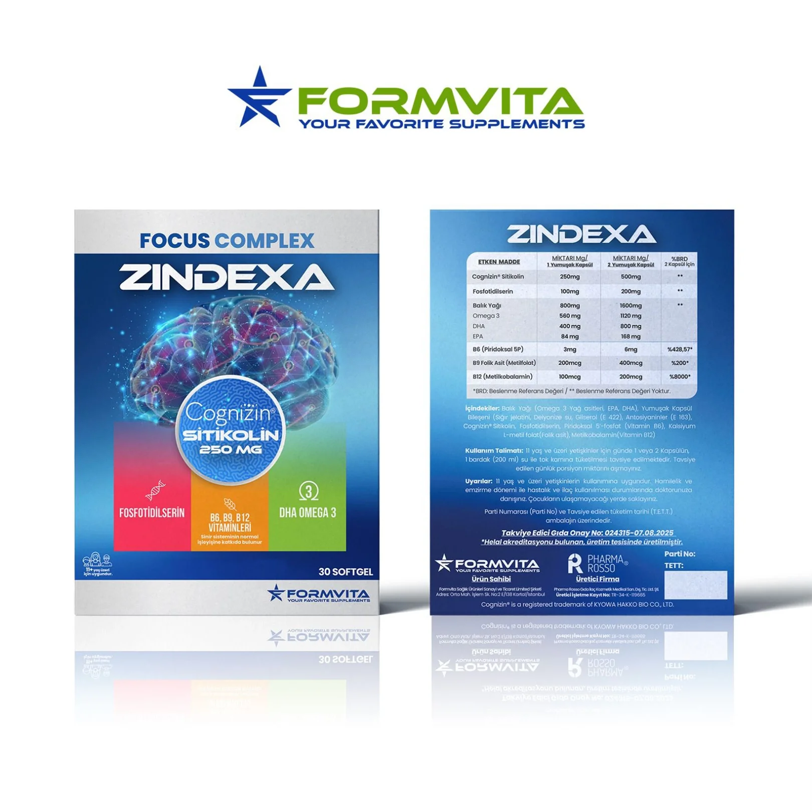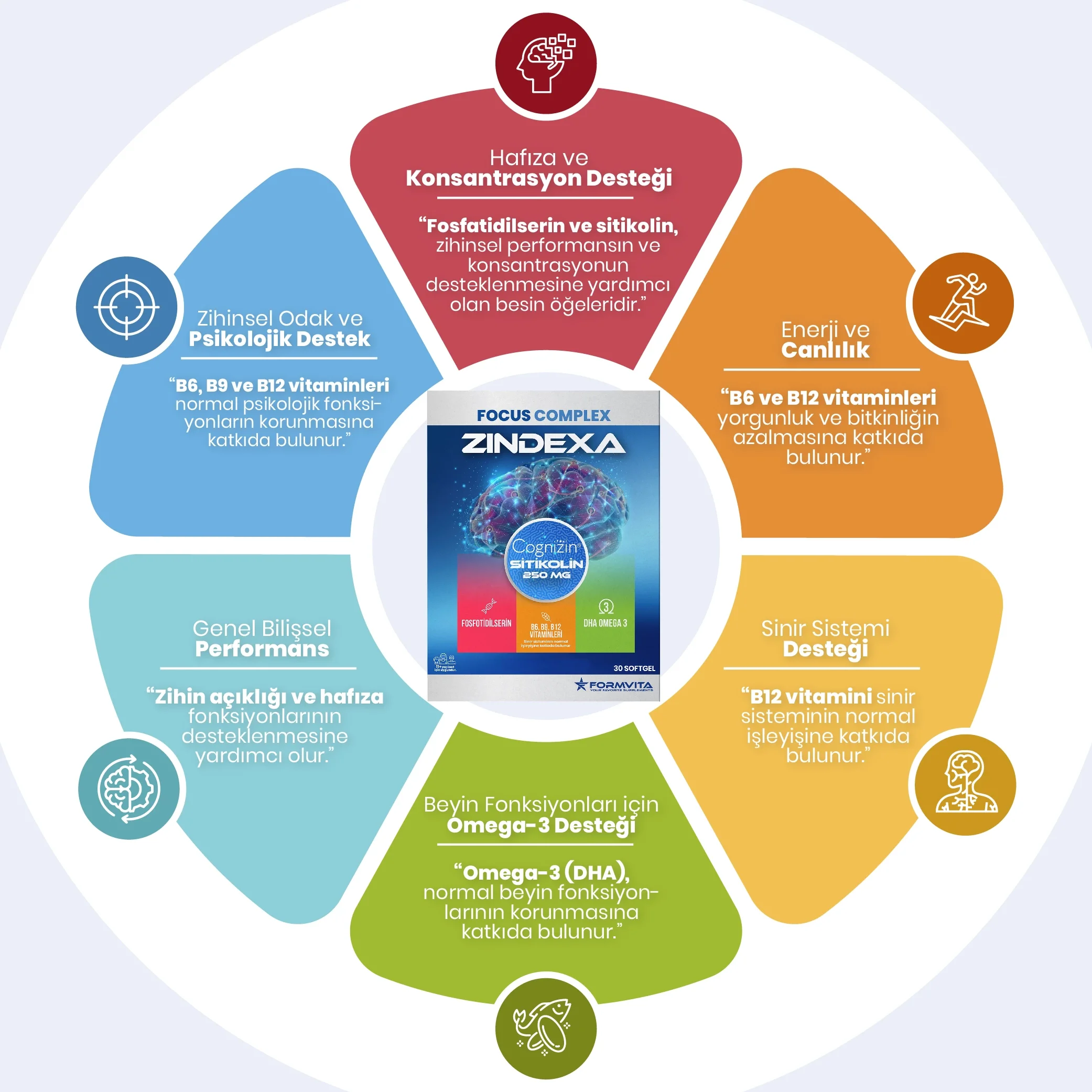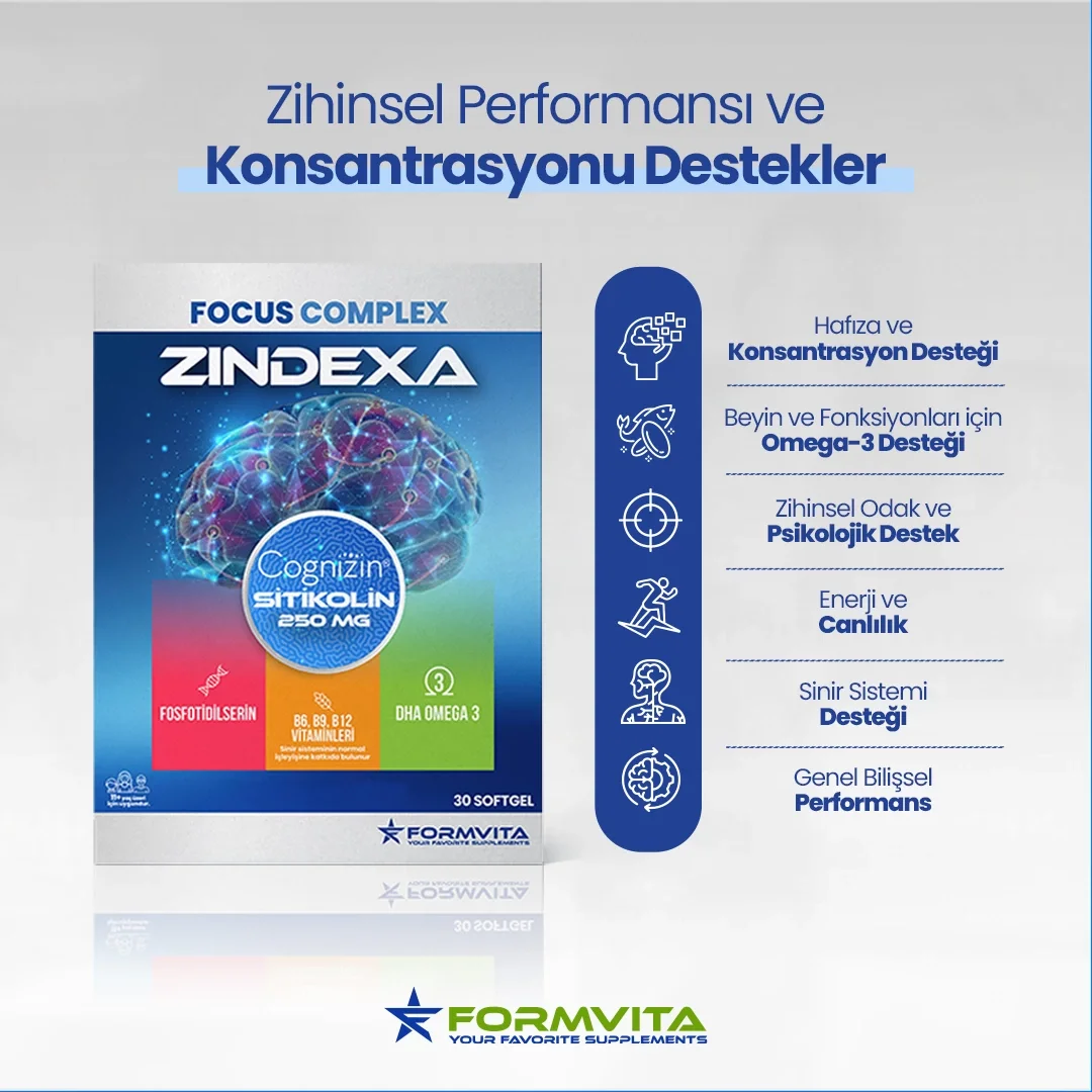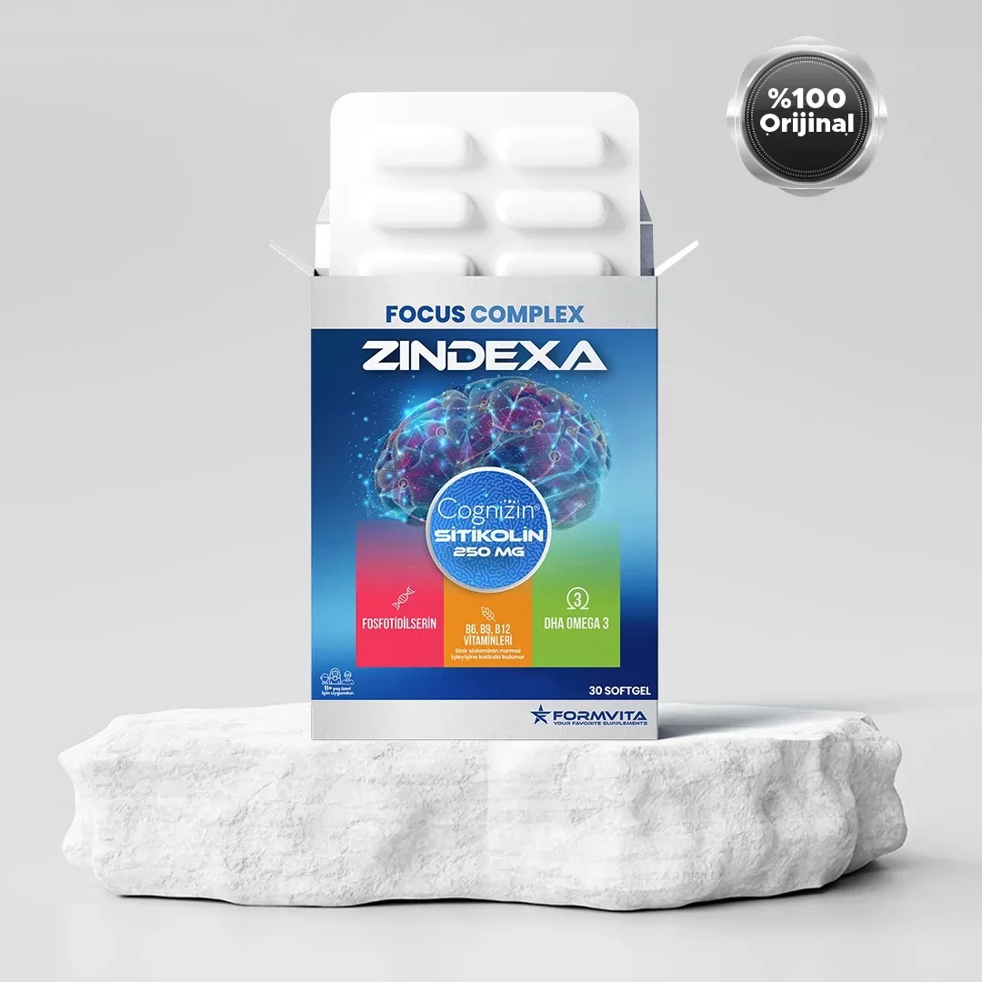 Focus Complex Zindexa, içeriğinde yer alan özel olarak seçilmiş Sitikolin(Cognizin),Fosfotidilserin, Omega 3, B12, B9 ve B6 bileşenleriyle 11 yaş üstü yetişkinlerin odaklanma, konsantrasyon ve hafıza performansını desteklemek amacıyla özel olarak geliştirilmiş softjel bir gıda takviyesidir.